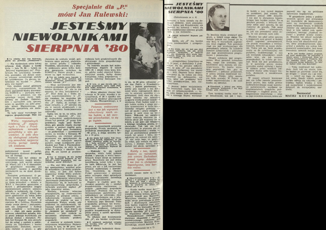 Archiwum / Wywiad nr 2508 (29/1993) 1/1 Podziel się Tytuł Jesteśmy niewolnikami sierpnia '80 Autor Maciej Kuczewski Kategoria Wywiad Artykuł z numeru 2508 (29/1993) Data wydania 18 lipca 1993 Tagi Jan Rulewski polityka solidarność