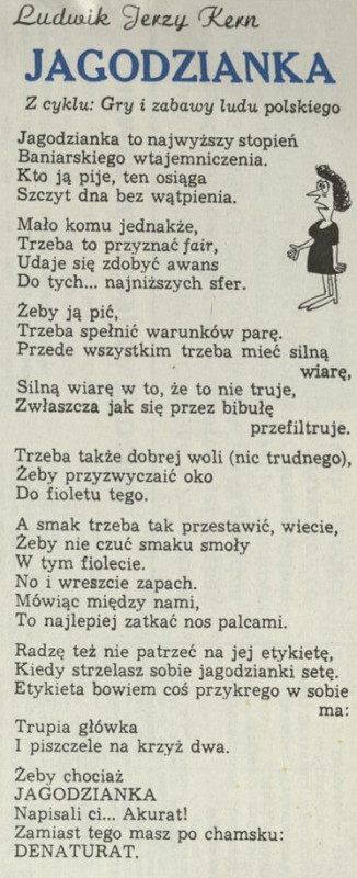 Archiwum / Rozmaitości nr 2508 (29/1993) 36/90 Podziel się Tytuł Jagodzianka Autor Ludwik Jerzy Kern Rubryka Rozmaitości Artykuł z numeru 2508 (29/1993) Data wydania 18 lipca 1993 Tagi Ludwik Jerzy Kern poezja gry i zabawy ludu polskiego jagody