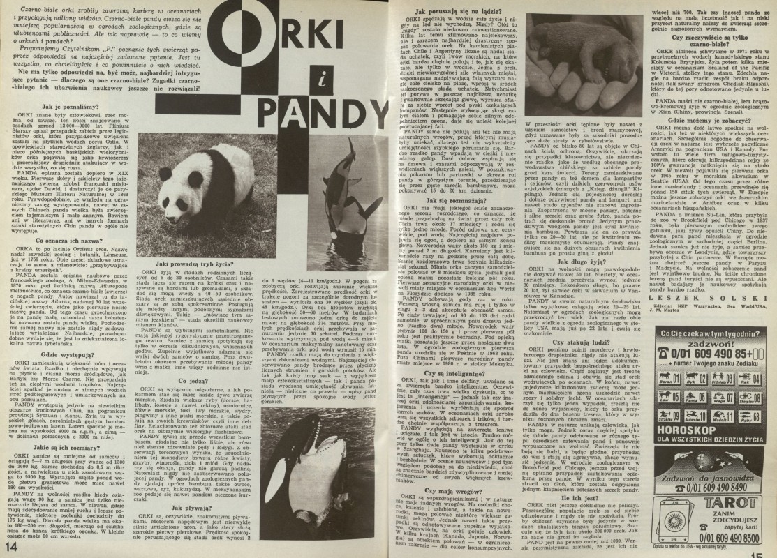 Archiwum / Różności nr 2509 (30/1993) 02/23 Podziel się Tytuł Orki i pandy Autor Leszek Solski Kategoria Różności Artykuł z numeru 2509 (30/1993) Data wydania 25 lipca 1993 Tagi zwierzęta orki pandy