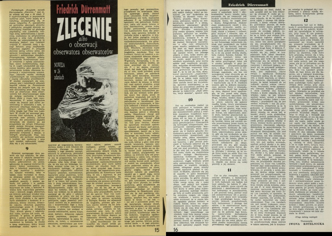 Archiwum / Proza nr 2471 (24/1992) 1/1 Podziel się Tytuł Zlecenie Autor Friedrich Durrenmatt Kategoria Proza Artykuł z numeru 2471 (2472/1992) Data wydania 1 listopada 1992