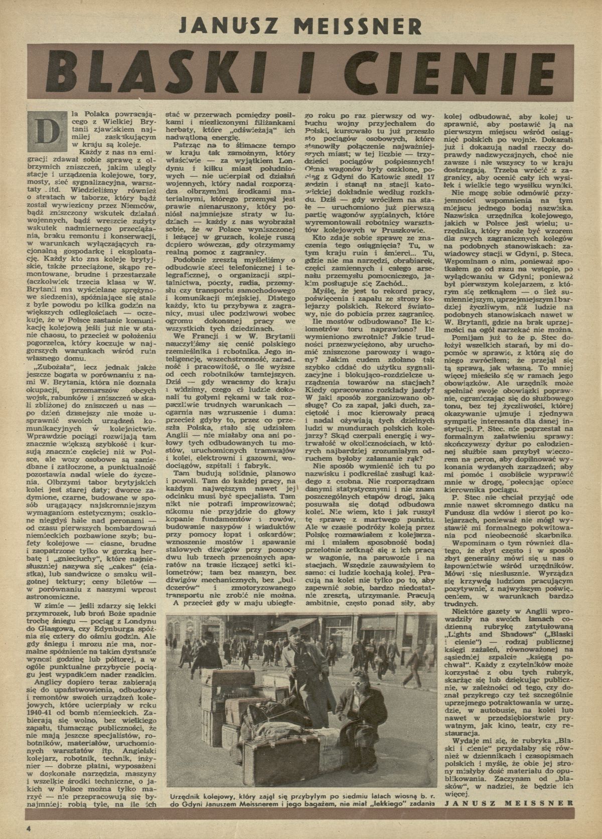 Archiwum / korespondencja własna "Przekroju" nr 94 (04/1947) 74/239 Podziel się Tytuł Blaski i cienie Autor Janusz Meissner Rubryka korespondencja własna "Przekroju" Artykuł z numeru 94 (4/1947) Data wydania 26 stycznia 1947 Tagi Wielka Brytania życie codzienne emigracja