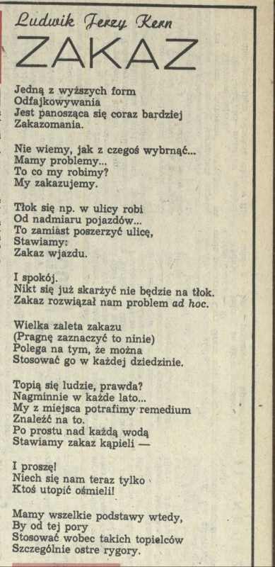 Archiwum / Rozmaitości [old] nr 2223 (03/1988) 08/129 Podziel się Tytuł Zakaz Autor Ludwik Jerzy Kern Rubryka Rozmaitości [old] Artykuł z numeru 2223 (3/1988) Data wydania 17 stycznia 1988