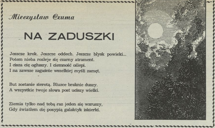 Archiwum / Poezja nr 2419 (24/1991) 06/39 Podziel się Tytuł Na zaduszki Autor Mieczysław Czuma Kategoria Poezja Artykuł z numeru 2419 (2420/1991) Data wydania 3 listopada 1991 Tagi wiersz śmierć