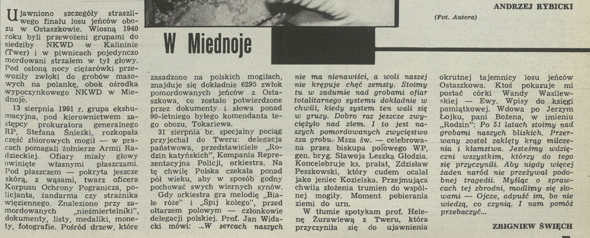 Archiwum / Artykuł nr 2419 (24/1991) 04/73 Podziel się Tytuł W Miednoje Autor Zbigniew Święch Kategoria Artykuł Artykuł z numeru 2419 (2420/1991) Data wydania 3 listopada 1991 Tagi Wojna ekshumacja NKWD zbiorowa mogiła