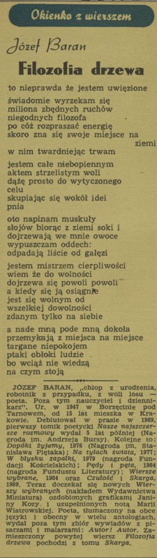 Archiwum / Okienko z wierszem nr 2419 (24/1991) 1/5 Podziel się Tytuł Filozofia drzewa Autor Józef Baran Rubryka Okienko z wierszem Artykuł z numeru 2419 (2420/1991) Data wydania 3 listopada 1991