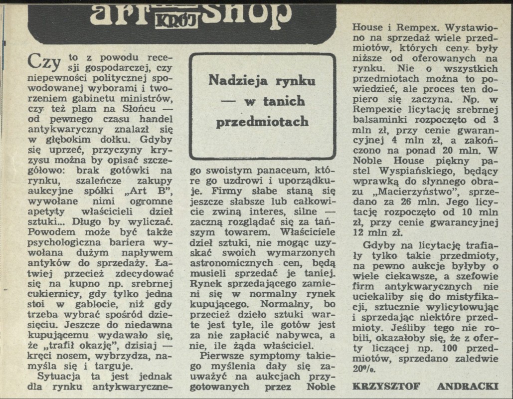 Archiwum / Komentarz nr 2425 (24/1991) 100527/123969 Podziel się Tytuł Art Shop. Nadzieja rynku - w tanich przedmiotach Autor Krzysztof Andracki Kategoria Komentarz Artykuł z numeru 2425 (2426/1991) Data wydania 15 grudnia 1991 Tagi aukcja malarstwo antyki