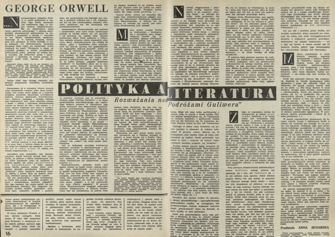 Archiwum / Artykuł nr 2330 (23/1990) 06/21 Podziel się Tytuł Polityka i literatura Autor Anna Husarska Kategoria Artykuł Artykuł z numeru 2330 (2331/1990) Data wydania 18 lutego 1990 Tagi George Orwell