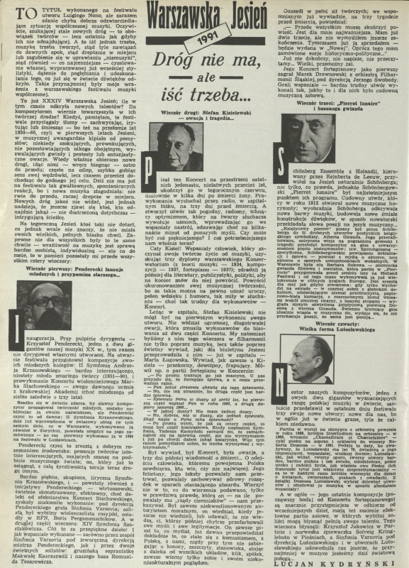 Archiwum / Artykuł nr 2417 (24/1991) 25/28 Podziel się Tytuł Dróg nie ma, ale iść trzeba Autor Lucjan Kydryński Kategoria Artykuł Artykuł z numeru 2417 (2418/1991) Data wydania 20 października 1991 Tagi warszawska jesień stefan kisielewski pierrot lunaire