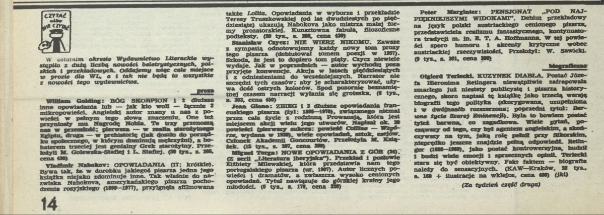 Archiwum / Czytać albo nie czytać? nr 2241 (21/1988) 92130/123969 Podziel się Tytuł Czytać albo nie czytać Rubryka Czytać albo nie czytać? Artykuł z numeru 2241 (21/1988) Data wydania 22 maja 1988