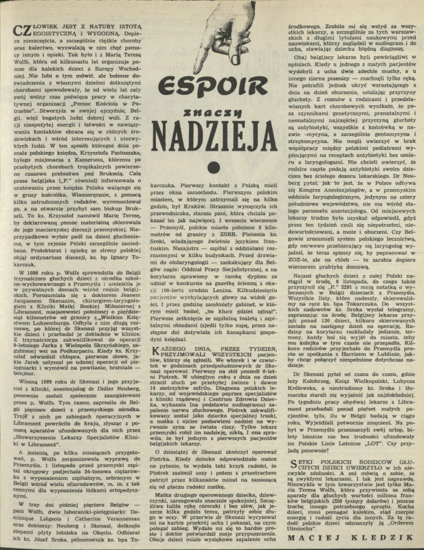 Archiwum / Artykuł nr 2325 (23/1990) 73/275 Podziel się Tytuł Espoir znaczy nadzieja Autor Maciej Kledzik Kategoria Artykuł Artykuł z numeru 2325 (2326/1990) Data wydania 14 stycznia 1990 Tagi giagnoza głuchota