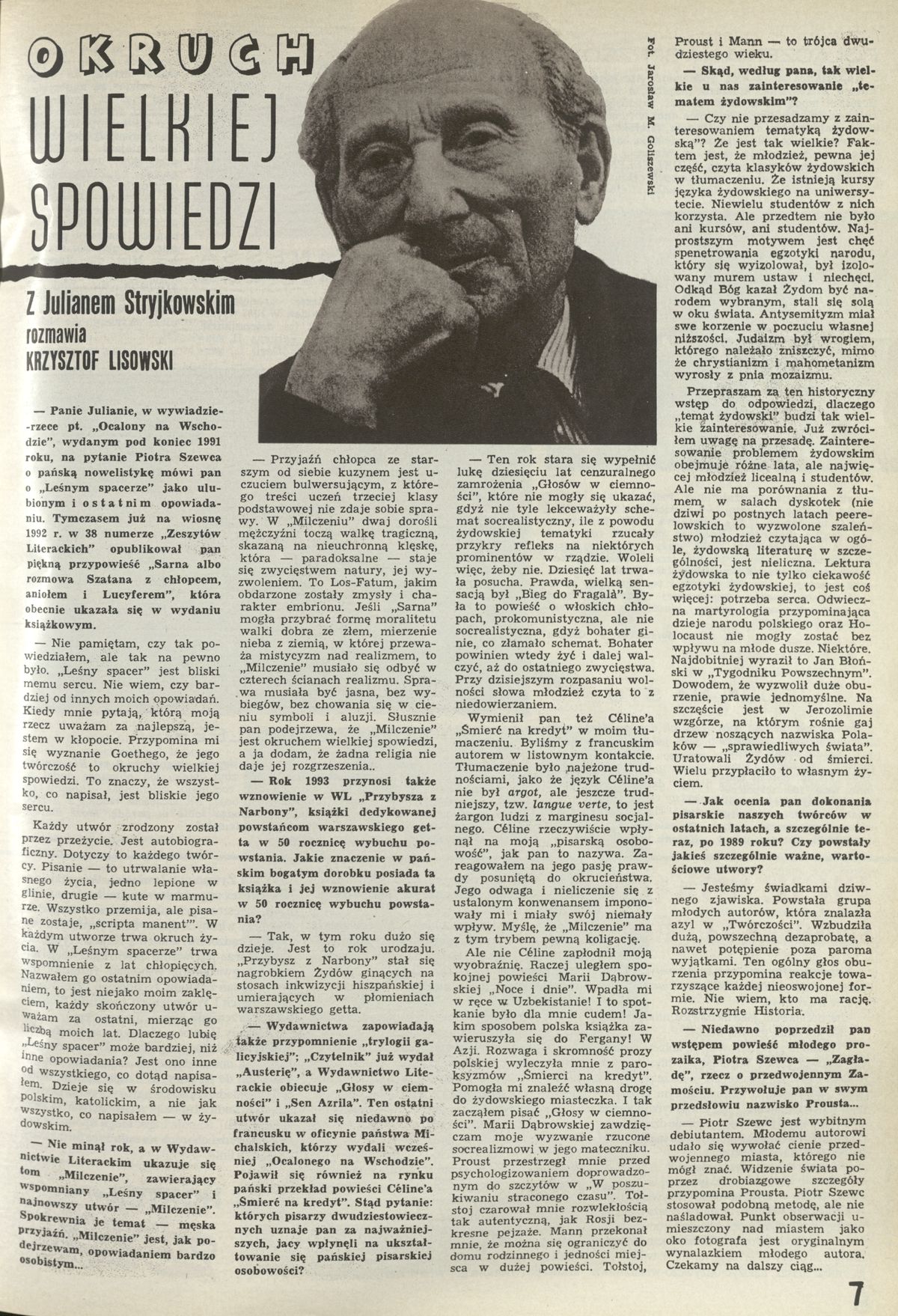 Archiwum / Rozmowy „Przekroju” nr 2511 (32/1993) 1/1 Podziel się Tytuł Okruch wielkiej spowiedzi Autor Krzystof Lisowski Rubryka Rozmowy „Przekroju” Artykuł z numeru 2511 (32/1993) Data wydania 8 sierpnia 1993 Tagi Julian Stryjkowski Ocalony na Wschodzie Leśny spacer