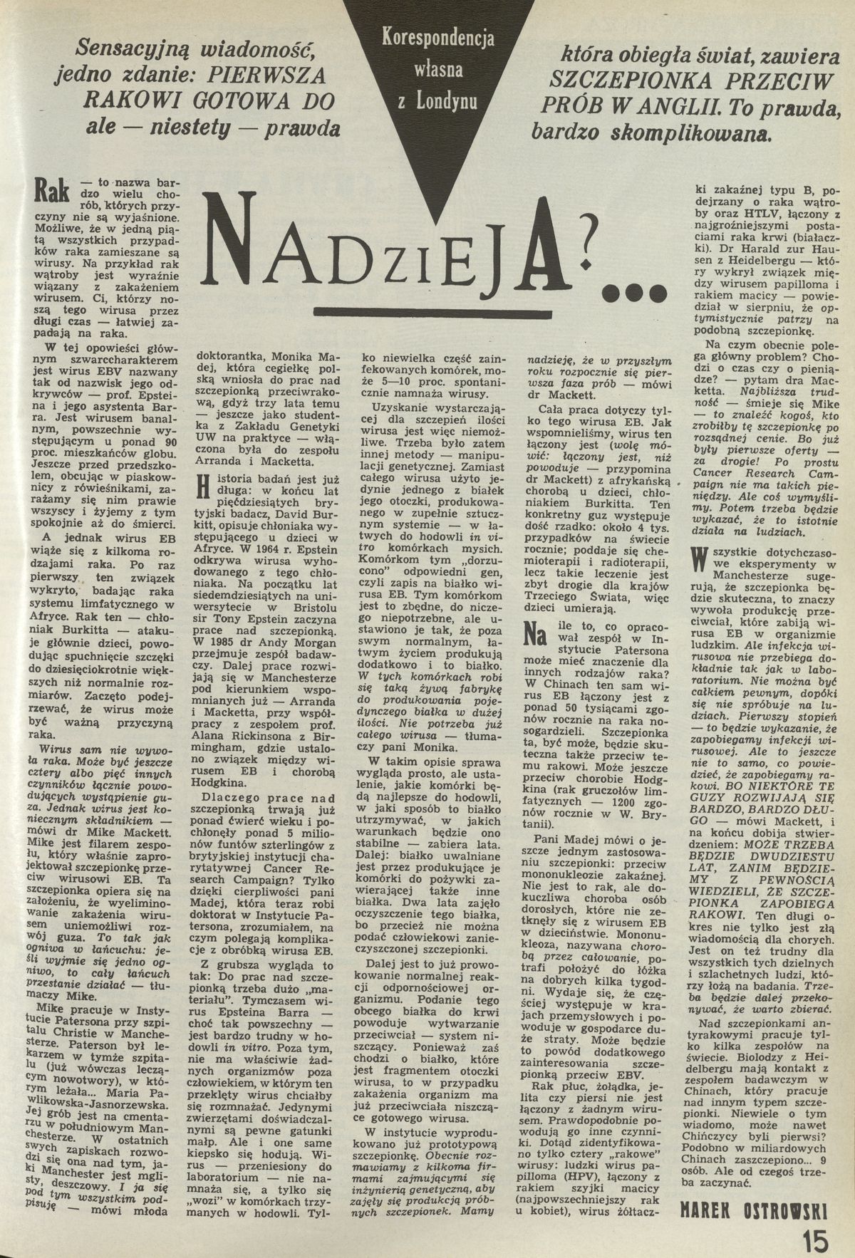 Archiwum / korespondencja własna "Przekroju" nr 2515 (36/1993) 39/50 Podziel się Tytuł Nadzieja? Autor Marek Ostrowski Rubryka korespondencja własna "Przekroju" Artykuł z numeru 2515 (36/1993) Data wydania 5 września 1993 Tagi rak nowotwór Anglia EBV