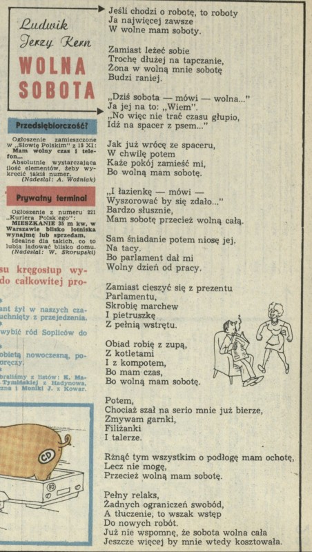 Archiwum / Rozmaitości [old] nr 2325 (23/1990) 95848/123969 Podziel się Tytuł Wolna sobota Autor Ludwik Jerzy Kern Rubryka Rozmaitości [old] Artykuł z numeru 2325 (2326/1990) Data wydania 14 stycznia 1990