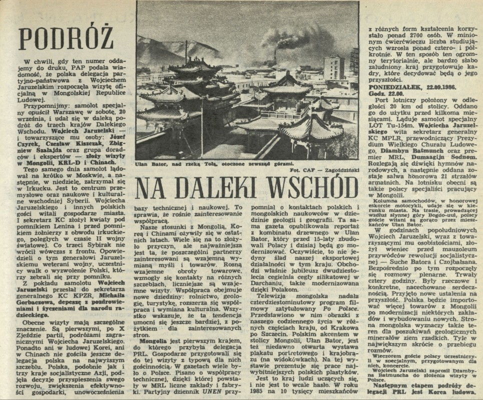 Archiwum / Artykuł nr 2155 (39/1986) 04/11 Podziel się Tytuł Podróż na Daleki Wschód Kategoria Artykuł Artykuł z numeru 2155 (39/1986) Data wydania 28 września 1986 Tagi PAP Mongolska Republika Ludowa Mongolia Jaruzelski Chiny polityka