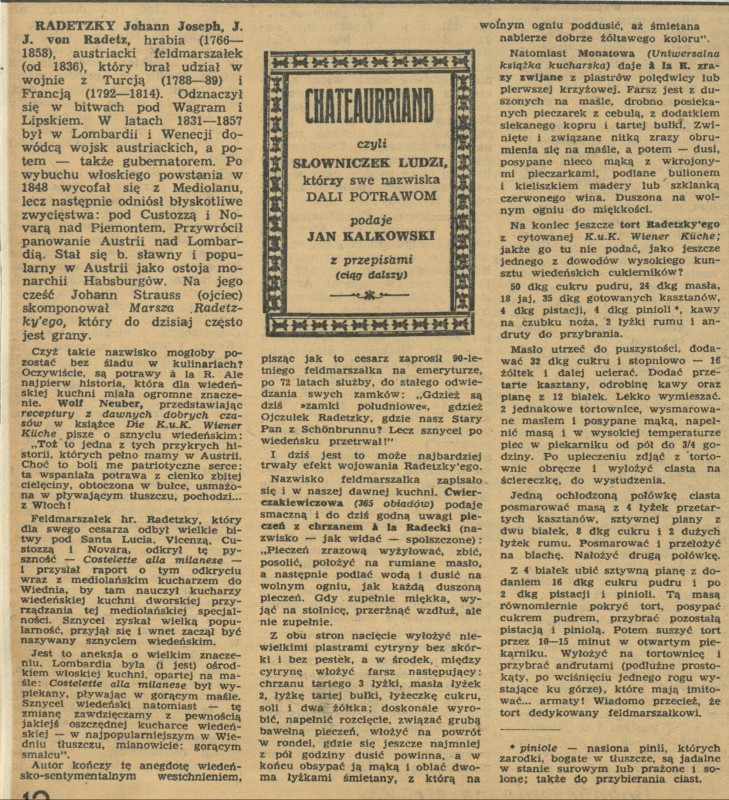 Archiwum / Różności nr 2155 (39/1986) 267/440 Podziel się Tytuł Chateaubriand czyli słowniczek ludzi, którzy swe nazwiska dali potrawom Autor Jan Kalkowski Kategoria Różności Artykuł z numeru 2155 (39/1986) Data wydania 28 września 1986 Tagi kulinaria gastronomia przepis kulinarny