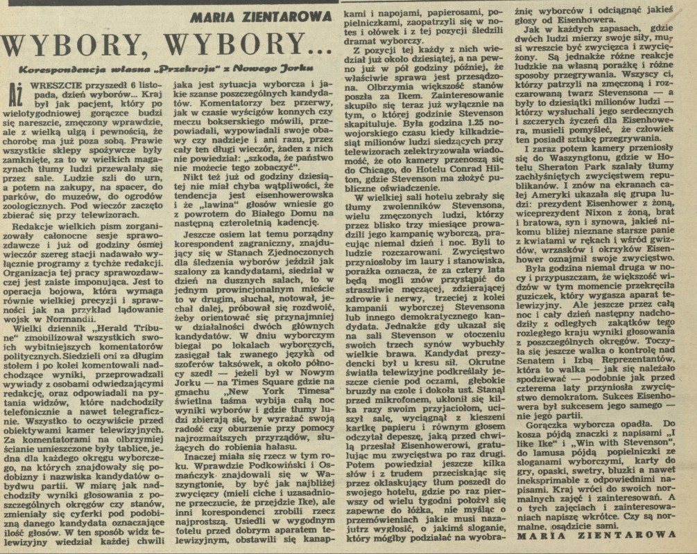 Archiwum / korespondencja własna "Przekroju" nr 607 (48/1956) 13/139 Podziel się Tytuł Wybory, wybory.... Autor Maria Zientarowa Rubryka korespondencja własna "Przekroju" Artykuł z numeru 607 (48/1956) Data wydania 25 listopada 1956 Tagi USA Nowy Jork Eisenhower Nixon prezydent wybory prezydenckie