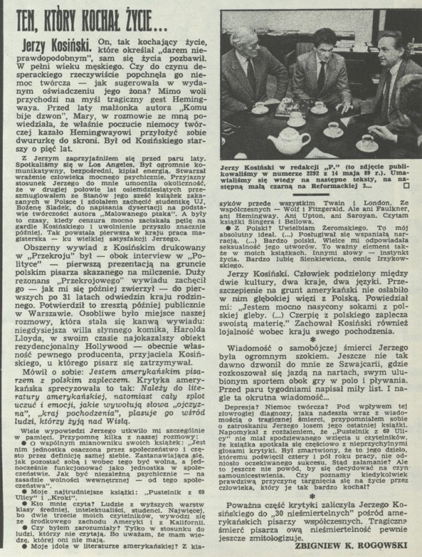Archiwum / Artykuł nr 2394 (23/1991) 203/472 Podziel się Tytuł Ten, który kochał życie.... Autor Zbigniew K. Rogowski Kategoria Artykuł Artykuł z numeru 2394 (2395/1991) Data wydania 12 maja 1991 Tagi Jerzy Kosiński
