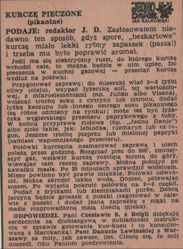 Archiwum / Jedno danie nr 2159 (43/1986) 88611/123969 Podziel się Tytuł Kurczę pieczone (pikantne) Autor Jan Kalkowski Rubryka Jedno danie Artykuł z numeru 2159 (43/1986) Data wydania 26 października 1986 Tagi kulinaria gastronomia przepis kulinarny