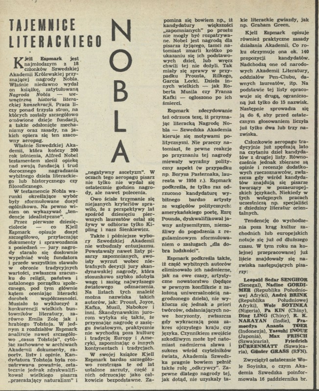 Archiwum / Kultura nr 2160 (44/1986) 88644/123969 Podziel się Tytuł Tajemnice literackiego Nobla Kategoria Kultura Artykuł z numeru 2160 (44/1986) Data wydania 2 listopada 1986 Tagi Literacka Nagroda Nobla Nobel Grass Kjell Espmark