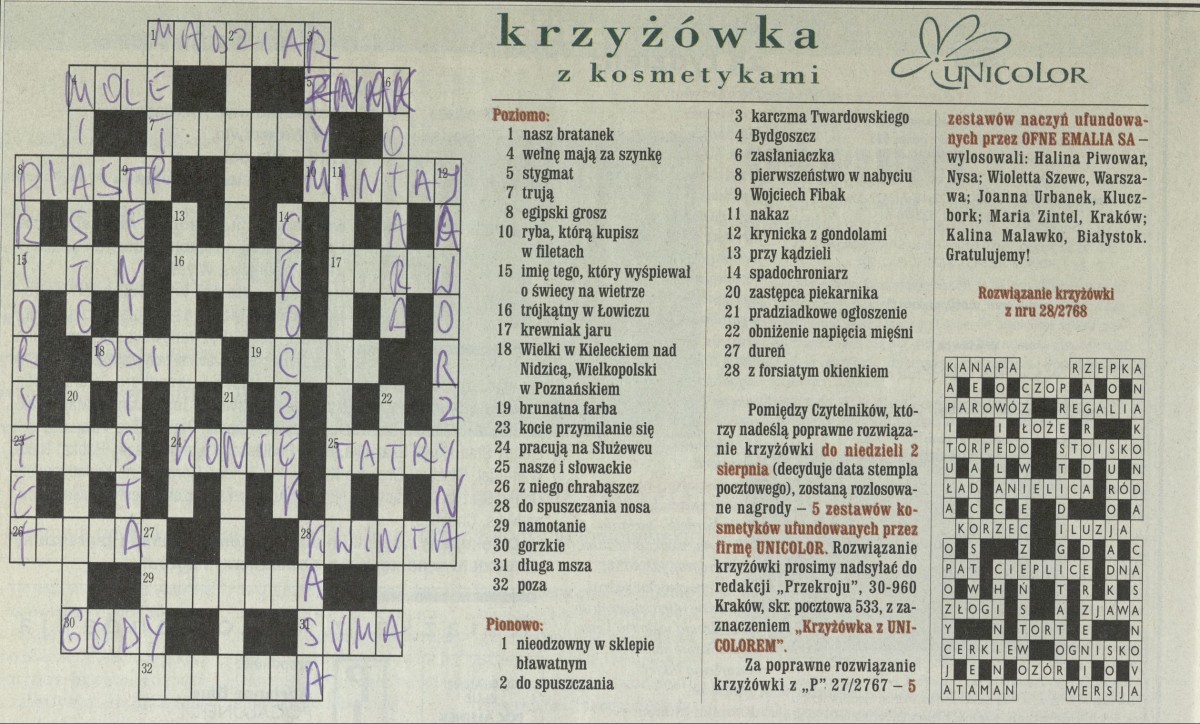Archiwum / Krzyżówka nr 2770 (27/1998) 114/799 Podziel się Tytuł Krzyżówka z kosmetykami Rubryka Krzyżówka Artykuł z numeru 2770 (2771/1998) Data wydania 26 lipca 1998