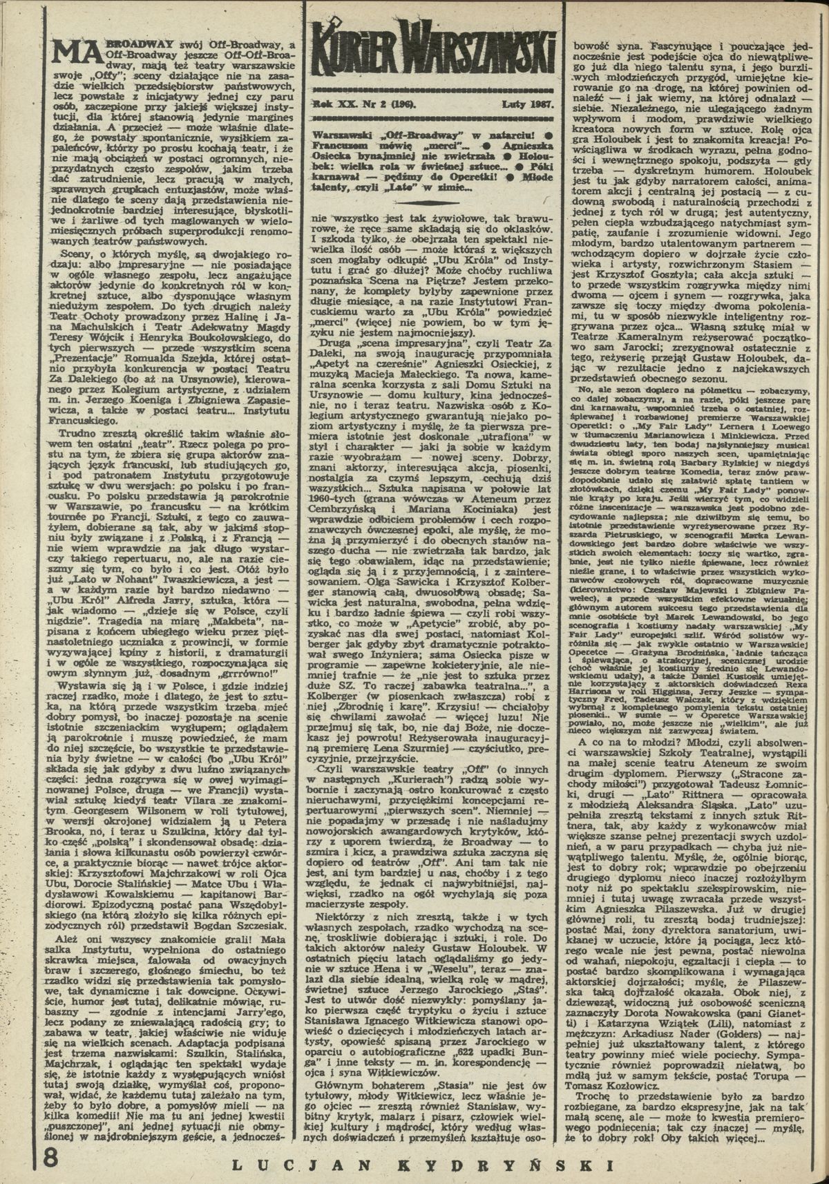 Archiwum / Kurier Warszawski nr 2176 (08/1987) 22/156 Podziel się Tytuł Kurier Warszawski Autor Lucjan Kydryński Rubryka Kurier Warszawski Artykuł z numeru 2176 (8/1987) Data wydania 22 lutego 1987 Tagi Off-Broadway Lato Agnieszka Osiecka
