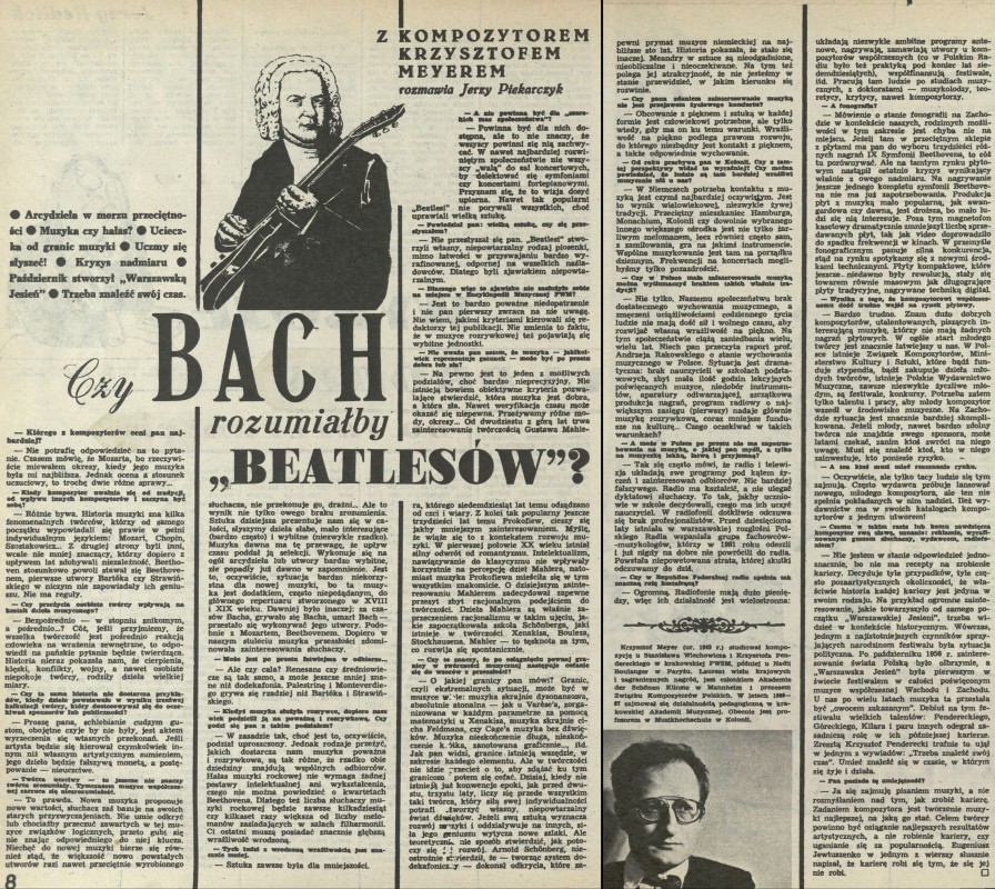 Archiwum / Wywiad nr 2235 (15/1988) 91857/123969 Podziel się Tytuł Czy Bach rozumiałby „Beatlesów”? Autor Jerzy Piekarczyk Kategoria Wywiad Artykuł z numeru 2235 (15/1988) Data wydania 10 kwietnia 1988 Tagi Krzysztof Meyer kompozytor historia muzyki muzyka klasyczna muzyka współczesna The Beatles