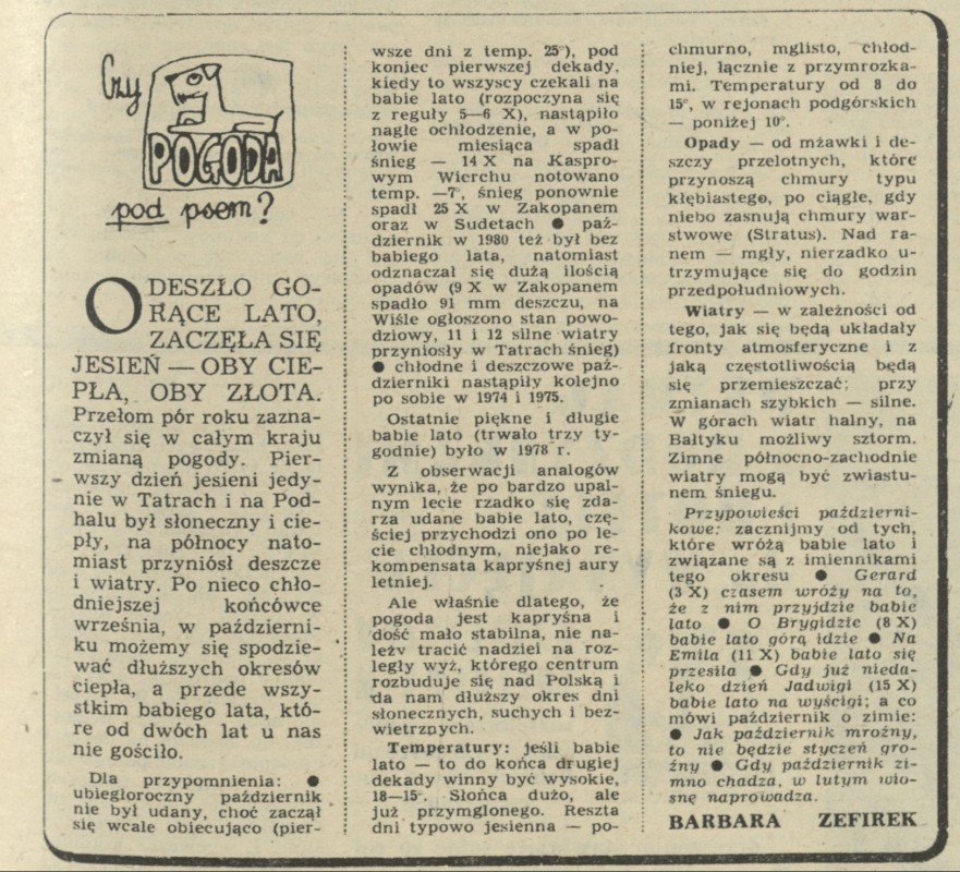 Archiwum / Czy pogoda pod psem? nr 1947 (33/1982) 271/391 Podziel się Tytuł Czy pogoda pod psem? Autor Barbara Zefirek Rubryka Czy pogoda pod psem? Artykuł z numeru 1947 (33/1982) Data wydania 3 października 1982 Tagi pogoda