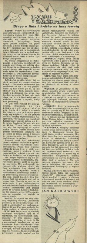 Archiwum / Relacja nr 613 (02/1957) 01/31 Podziel się Tytuł List z Zakopanego. Długo o linie i krótko na inne tematy Autor Jan Kalkowski Kategoria Relacja Artykuł z numeru 613 (2/1957) Data wydania 6 stycznia 1957 Tagi Zakopane góry wyciąg moda "Jędruś" gips