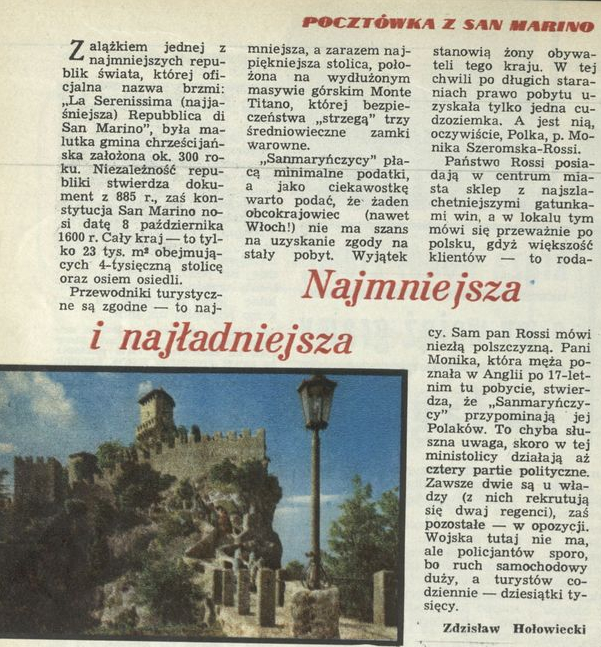 Archiwum / Relacja nr 2454 (24/1992) 27/69 Podziel się Tytuł Najmniejsza i najładniejsza Autor Zdzisław Hołowiecki Kategoria Relacja Artykuł z numeru 2454 (2455/1992) Data wydania 5 lipca 1992 Tagi San Marino