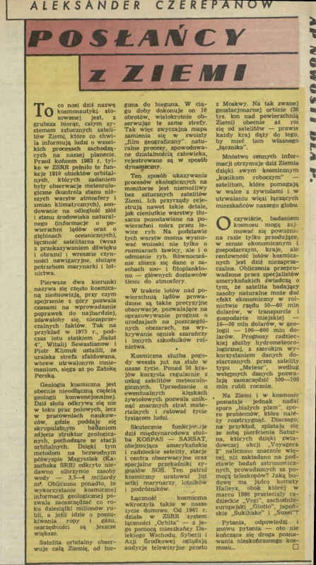Archiwum / korespondencja własna "Przekroju" nr 2186 (18/1987) 142/170 Podziel się Tytuł Posłańcy z ziemi Autor Aleksander Czerepanow Rubryka korespondencja własna "Przekroju" Artykuł z numeru 2186 (18/1987) Data wydania 3 maja 1987 Tagi ZSRR kosmos Moskwa