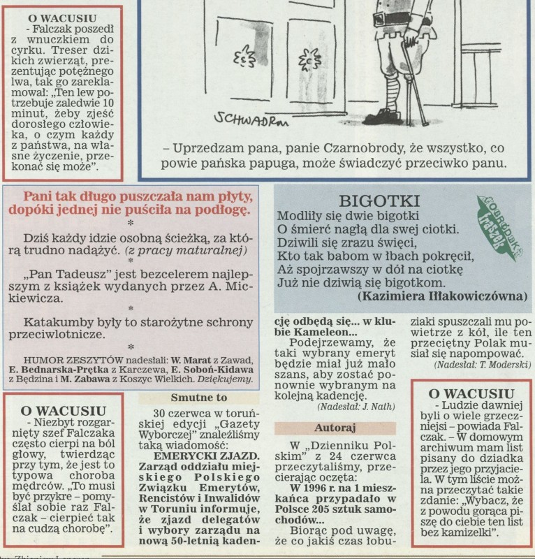 Archiwum / O Wacusiu nr 2771 (27/1998) 119340/123969 Podziel się Tytuł O Wacusiu Rubryka O Wacusiu Artykuł z numeru 2771 (2772/1998) Data wydania 2 sierpnia 1998 Tagi Falczak