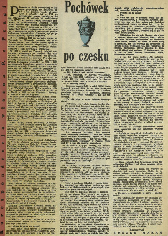Archiwum / korespondencja własna "Przekroju" nr 2229 (09/1988) 101/635 Podziel się Tytuł Pochówek po czesku Autor Leszek Mazan Rubryka korespondencja własna "Przekroju" Artykuł z numeru 2229 (9/1988) Data wydania 28 lutego 1988 Tagi śmierć krematorium kremacja cmentarz