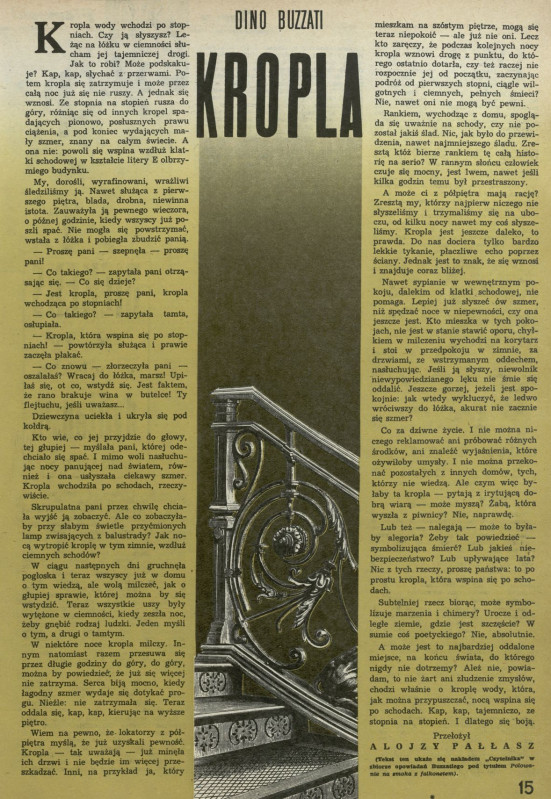 Archiwum / Opowiadanie nr 2224 (04/1988) 2/7 Podziel się Tytuł Kropla Autor Dino Buzzati Alojzy Pałłasz Kategoria Opowiadanie Artykuł z numeru 2224 (4/1988) Data wydania 24 stycznia 1988