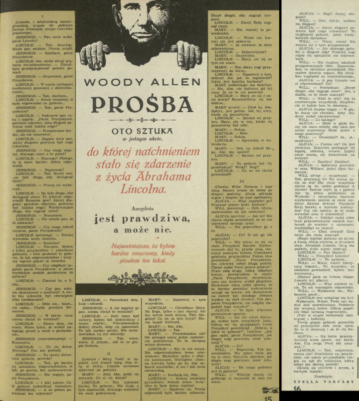 Archiwum / Opowiadanie nr 1955 (41/1982) 80412/123969 Podziel się Tytuł Prośba Autor Woody Allen Stella Varcaby Kategoria Opowiadanie Artykuł z numeru 1955 (41/1982) Data wydania 28 listopada 1982 Tagi literatura amerykańska humor Abraham Lincoln