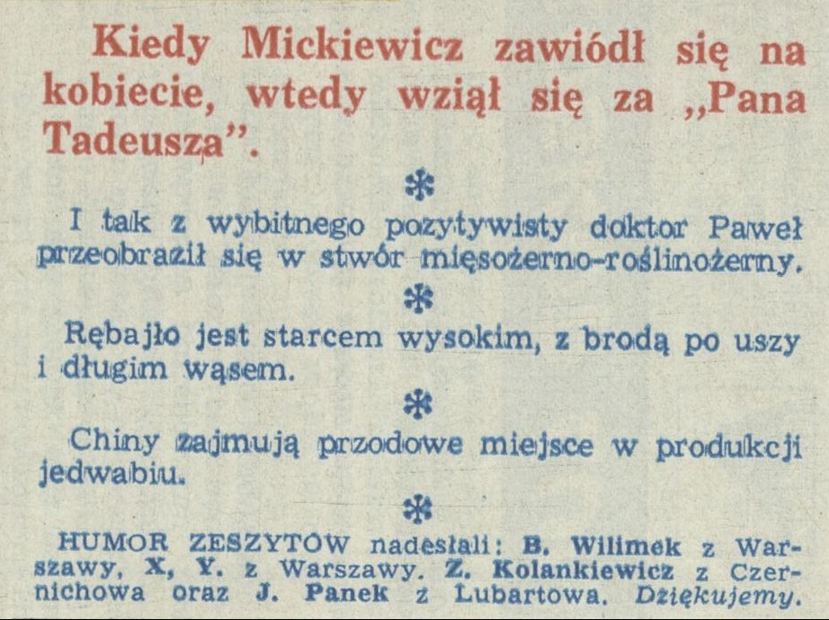 Archiwum / Humor zeszytów szkolnych nr 2410 (24/1991) 35/48 Podziel się Tytuł Humor zeszytów szkolnych Rubryka Humor zeszytów szkolnych Artykuł z numeru 2410 (2411/1991) Data wydania 1 września 1991