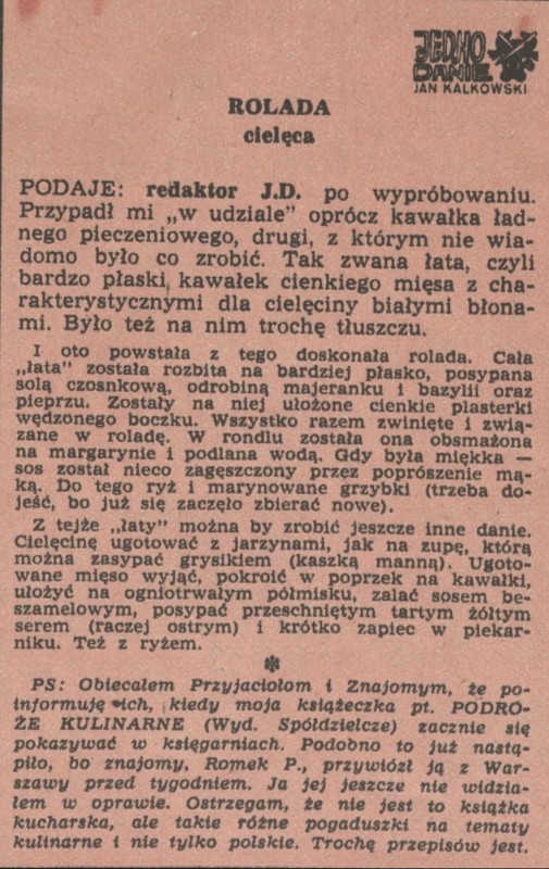 Archiwum / Jedno danie nr 2041 (30/1984) 256/1212 Podziel się Tytuł Rolada cielęca Autor Jan Kalkowski Rubryka Jedno danie Artykuł z numeru 2041 (30/1984) Data wydania 22 lipca 1984