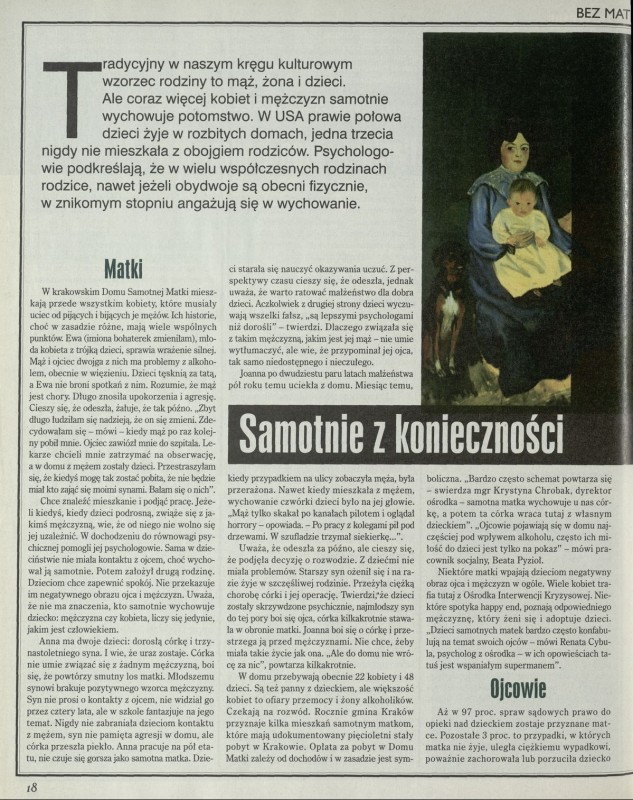 Archiwum / Artykuł nr 2817 (28/1999) 241/19817 Podziel się Tytuł Samotnie z konieczności Autor Monika Wąs Kategoria Artykuł Artykuł z numeru 2817 (2818/1999) Data wydania 20 czerwca 1999 Tagi matki dzieci ojcowie