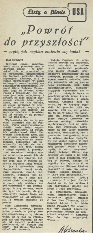 Archiwum / Listy o filmie nr 2149 (33/1986) 19/28 Podziel się Tytuł „Powrót do przyszlości” - czyli, jak szybko zmienia się świat Autor Aleksandra Rubryka Listy o filmie Artykuł z numeru 2149 (33/1986) Data wydania 17 sierpnia 1986 Tagi kinematografia amerykańska fantasy film przygodowy Zemeckis