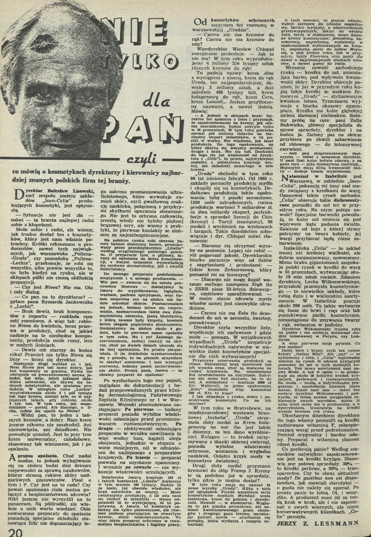Archiwum / Różności nr 2151 (35/1986) 88228/123969 Podziel się Tytuł Nie tylko dla pań Autor Jerzy Z. Lessman Kategoria Różności Artykuł z numeru 2151 (35/1986) Data wydania 31 sierpnia 1986 Tagi kosmetyki kosmetologia uroda