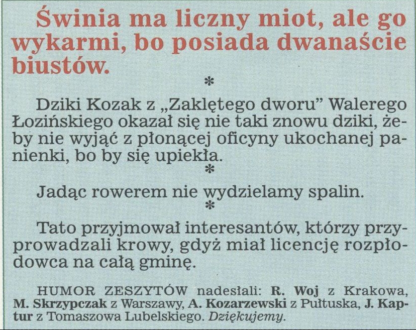 Archiwum / Humor zeszytów szkolnych nr 2834 (28/1999) 48/59 Podziel się Tytuł Humor zeszytów Rubryka Humor zeszytów szkolnych Artykuł z numeru 2834 (2835/1999) Data wydania 17 października 1999 Tagi powiedzonka