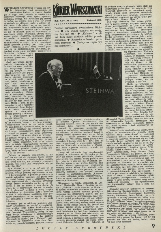 Archiwum / Kurier Warszawski nr 2477 (24/1992) 166/174 Podziel się Tytuł Kurier Warszawski Autor Lucjan Kydryński Rubryka Kurier Warszawski Artykuł z numeru 2477 (2478/1992) Data wydania 13 grudnia 1992 Tagi Swiatosław Richter