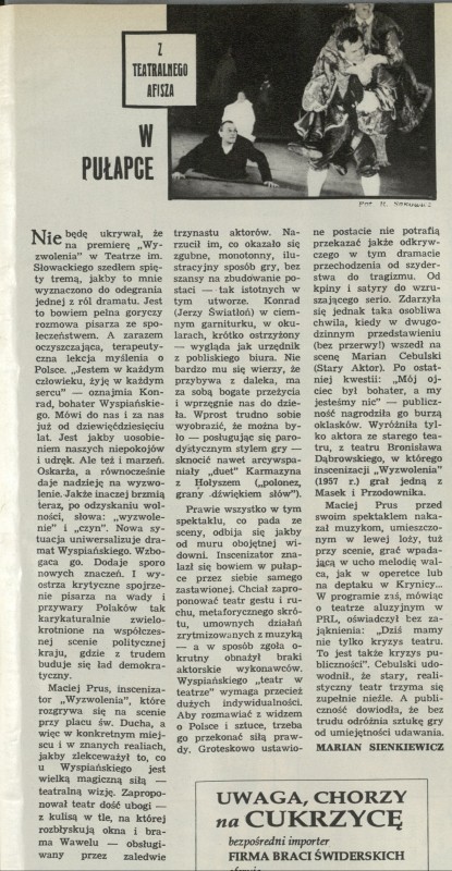 Archiwum / Teatr nr 2477 (24/1992) 01/50 Podziel się Tytuł Z teatralnego afisza. W pułapce Autor Marian Sienkiewicz Rubryka Teatr Artykuł z numeru 2477 (2478/1992) Data wydania 13 grudnia 1992 Tagi "Wyzwolenie" Teatr im. Słowackiego Maciej Prus