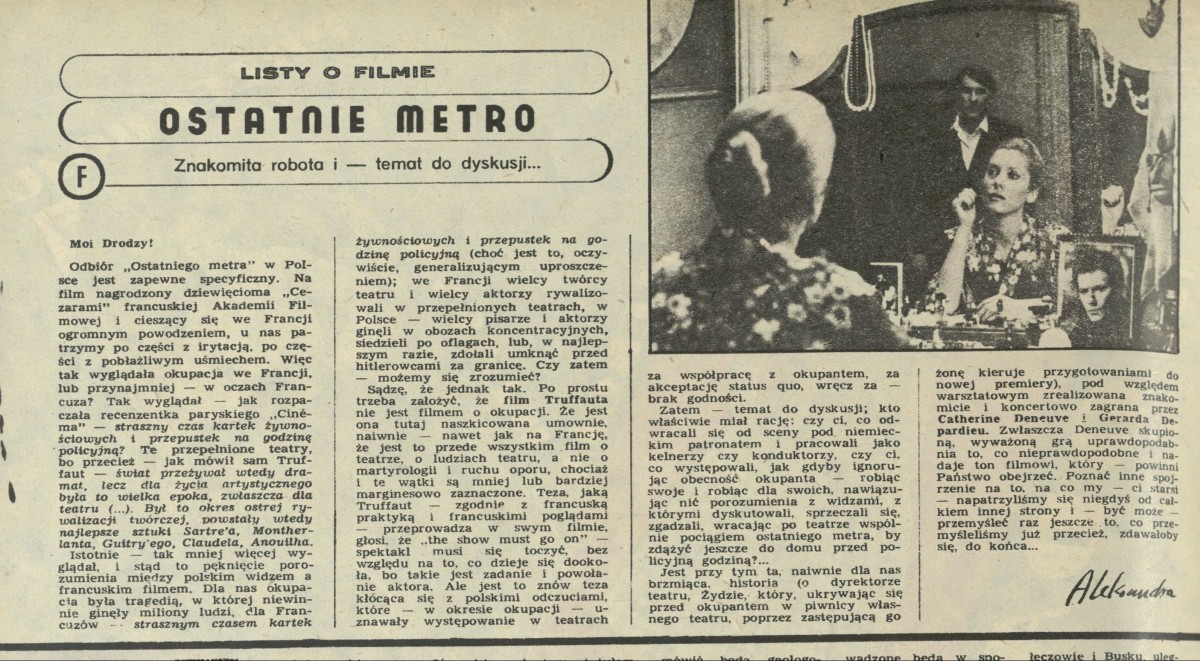 Archiwum / Listy o filmie nr 1979 (20/1983) 30/78 Podziel się Tytuł Ostatnie metro Autor Aleksandra Rubryka Listy o filmie Artykuł z numeru 1979 (20/1983) Data wydania 15 maja 1983