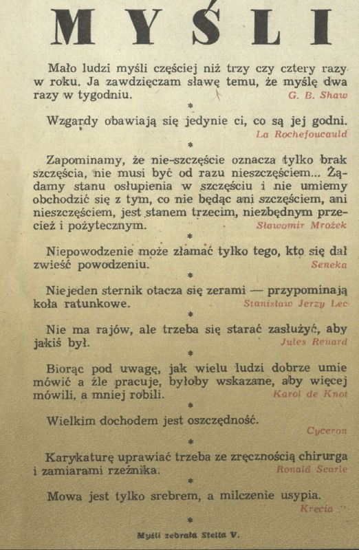 Archiwum / Myśli nr 1960 (01/1983) 80602/123969 Podziel się Tytuł Myśli Autor Stella Varcaby Rubryka Myśli Artykuł z numeru 1960 (1/1983) Data wydania 2 stycznia 1983 Tagi cytaty aforyzmy