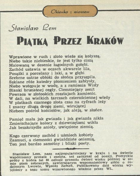 Archiwum / Okienko z wierszem nr 2433 (24/1992) 03/36 Podziel się Tytuł Piątka przez Kraków Autor Stanisław Lem Rubryka Okienko z wierszem Artykuł z numeru 2433 (2434/1992) Data wydania 9 lutego 1992