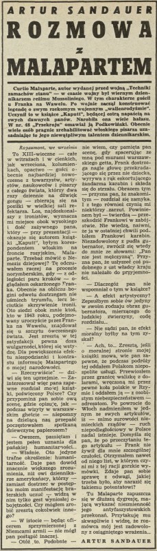 Archiwum / Wywiad nr 126 (36/1947) 38/3498 Podziel się Tytuł Rozmowa z Malapartem Autor Artur Sandauer Kategoria Wywiad Artykuł z numeru 126 (36/1947) Data wydania 7 września 1947 Tagi Curtio Malsparte