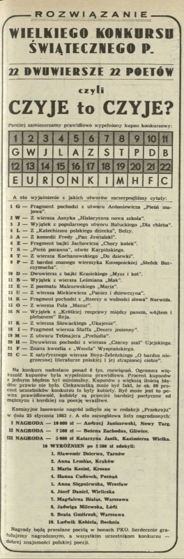 Archiwum / Konkurs nr 1965 (06/1983) 80823/123969 Podziel się Tytuł Rozwiązanie wielkiego konkursu świątecznego P. Rubryka Konkurs Artykuł z numeru 1965 (6/1983) Data wydania 6 lutego 1983
