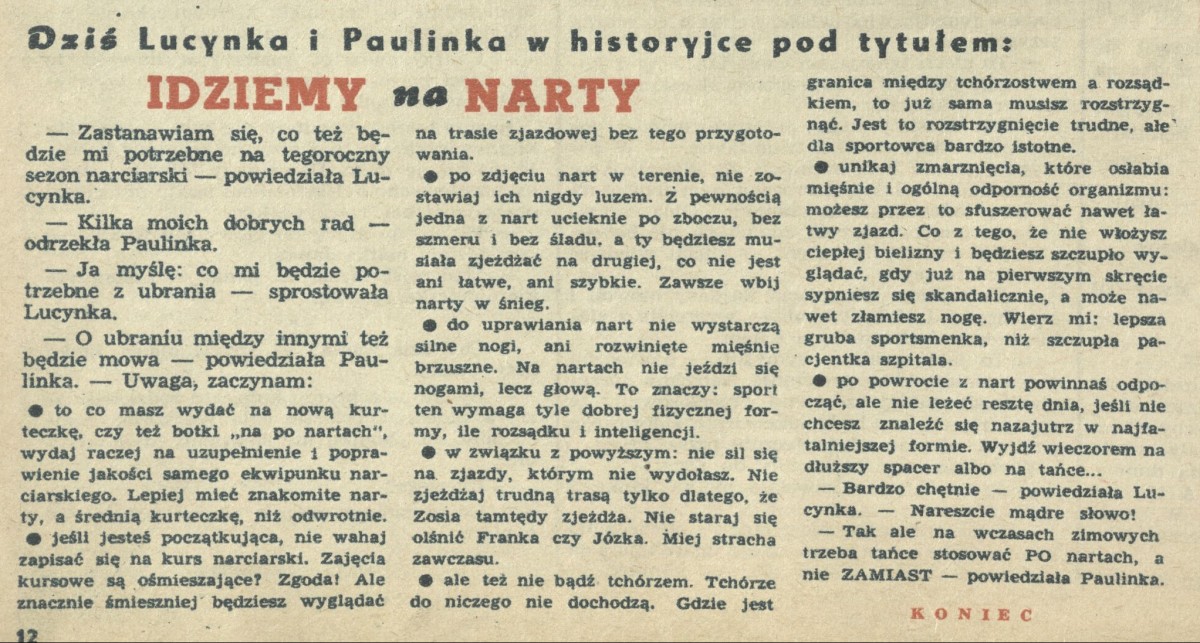 Archiwum / Dziś Lucynka i Paulinka nr 508 (01/1955) 01/49 Podziel się Tytuł Idziemy na narty Autor Lucynka i Paulinka Rubryka Dziś Lucynka i Paulinka Artykuł z numeru 508 (1/1955) Data wydania 1 stycznia 1955 Tagi porady narciarstwo narty
