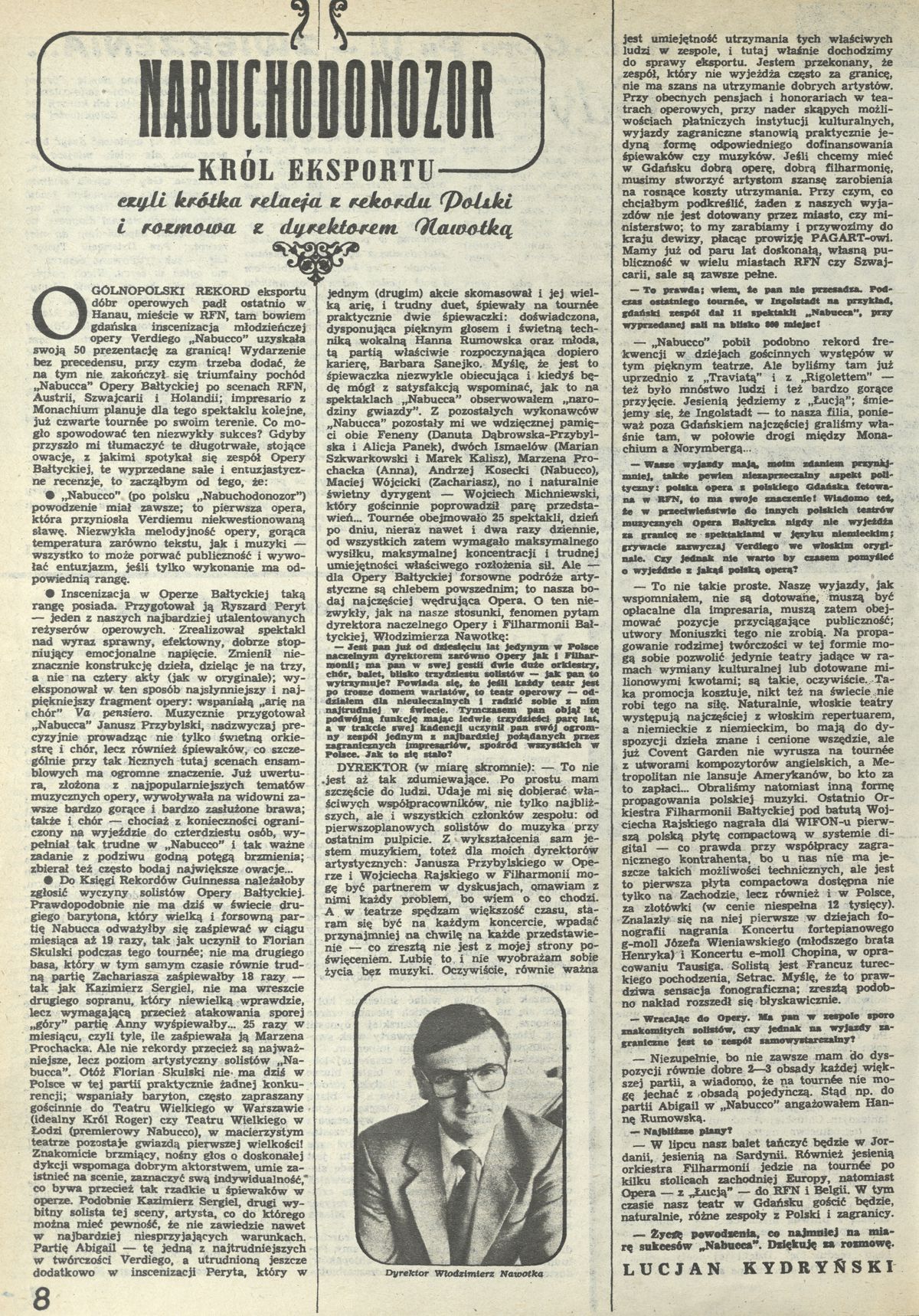 Archiwum / Wywiad nr 2239 (19/1988) 06/21 Podziel się Tytuł Nabuchodonozor Autor Lucjan Kydryński Kategoria Wywiad Artykuł z numeru 2239 (19/1988) Data wydania 8 maja 1988 Tagi Włodzimierz Nawrotka eksport