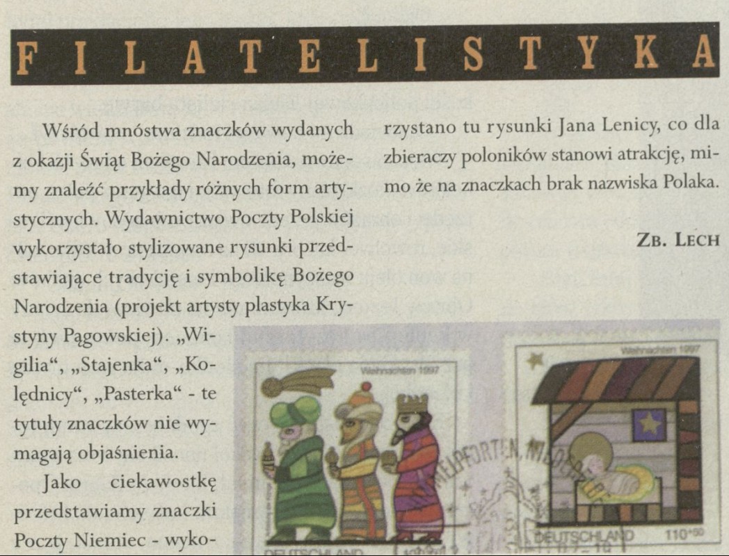 Archiwum / Filatelistyka nr 2746 (27/1998) 117913/123969 Podziel się Tytuł Filatelistyka Autor Zbigniew Lech Rubryka Filatelistyka Artykuł z numeru 2746 (2747/1998) Data wydania 8 lutego 1998 Tagi znaczki pocztowe Święta Bożego Narodzenia Lenica